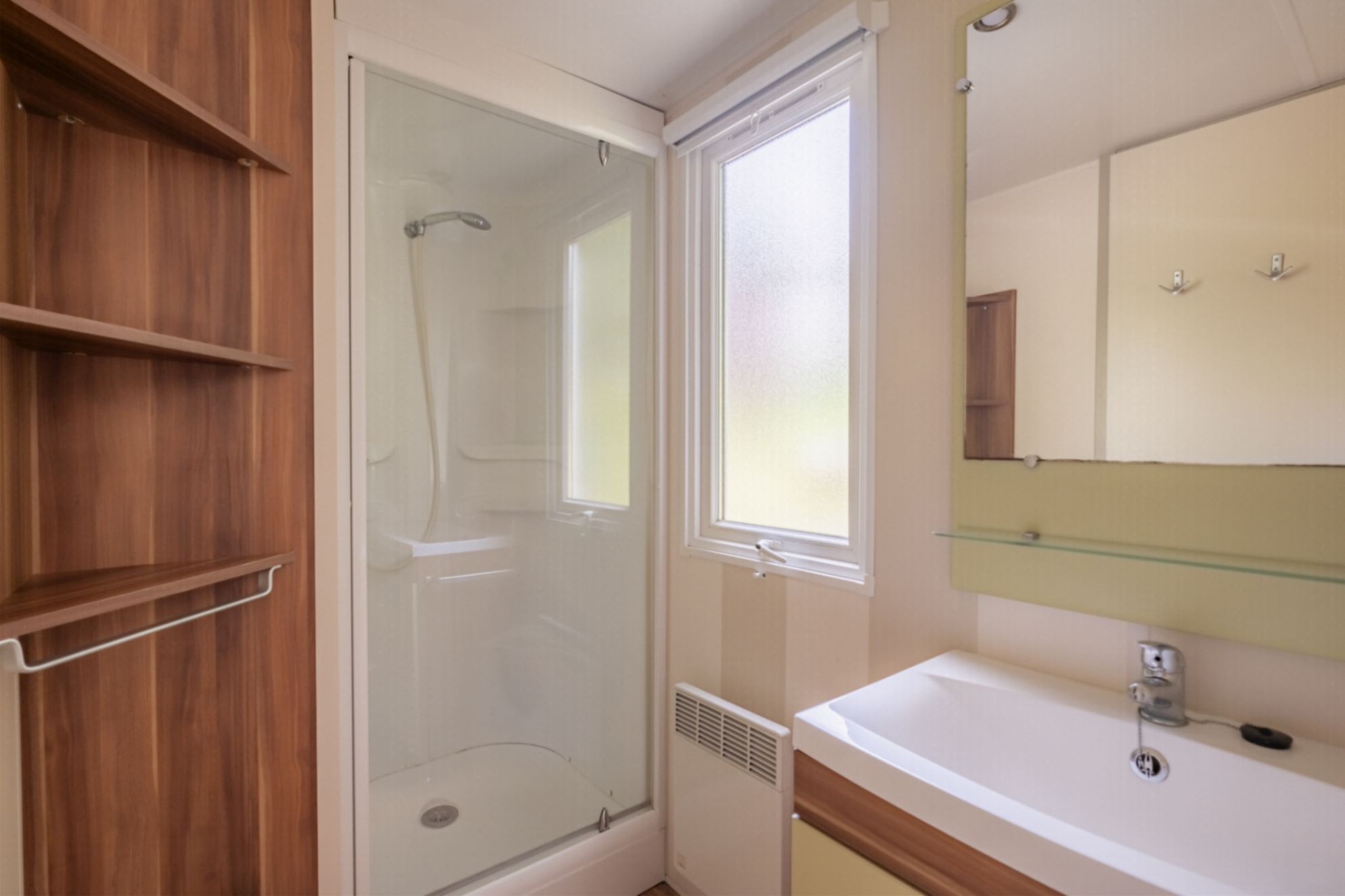 Sanitaire : salle d’eau avec douche, lavabo, sèche-serviette et WC séparés.