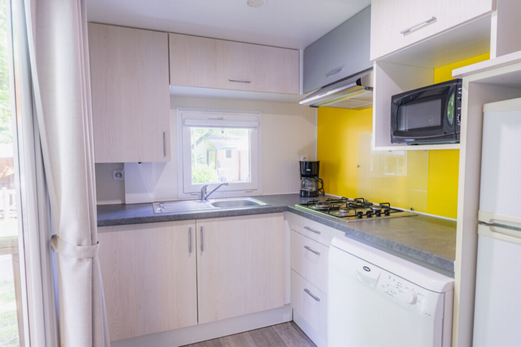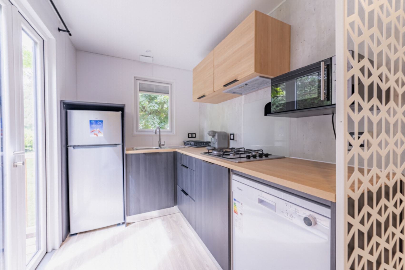 Coin séjour/cuisine : cuisine équipée (évier, feux gaz, réfrigérateur/congélateur, cafetière Tassimo ou à filtre, micro-ondes, vaisselle), climatisation réversible, télévision.
