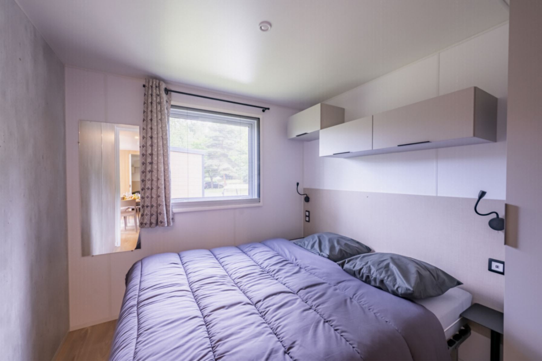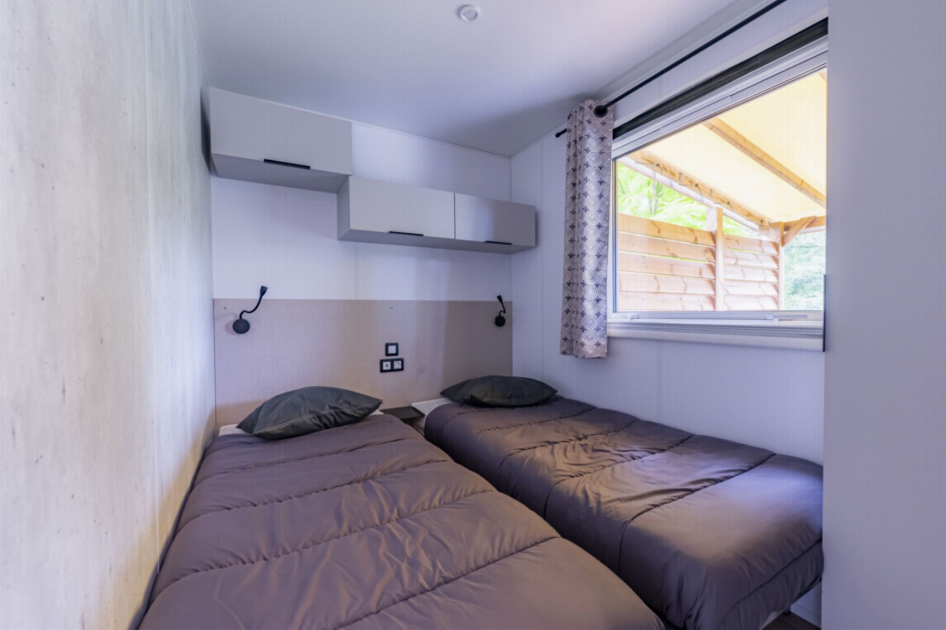 Coin nuit : une chambre avec 1 lit double (160×190), deux chambres avec deux lits simples (80×190) côte à côte, couettes et oreillers fournis.